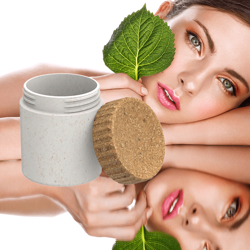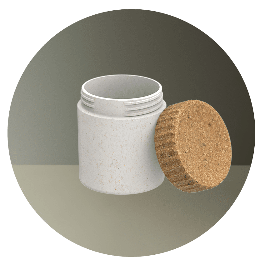 123 ml Volumatik. Round-shaped premium sustainable cosmetic supplement jar. Made of patented two-layer structured bio-based Sulapac Premium (SUL-P) with Volumatik neck finish. Collection Volumatik is a high quality recyclable and compostable packaging solution for water-based cosmetic applications. Outer layer has large visible wood chips in its surface. Dimensions: (D x H) 58 mm x 73 mm and a weight of 85 gram.