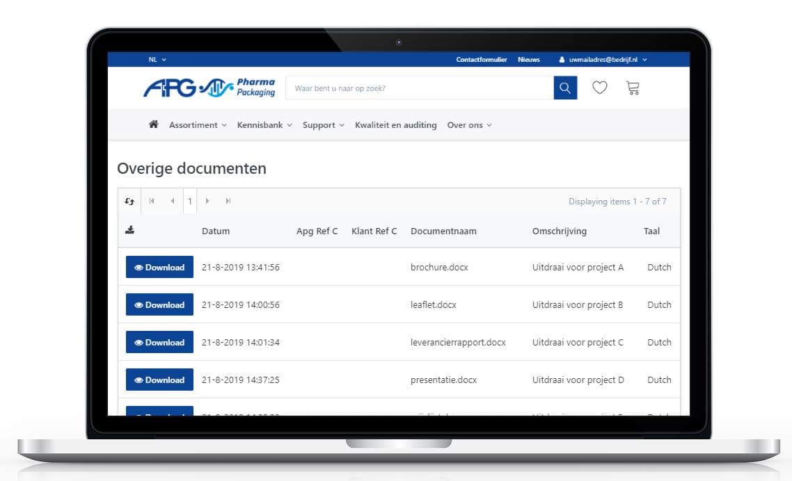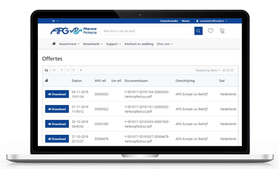 When requesting prices for specific items, quantities and place of delivery you will receive a detailed quote from APG Europe. All quotes that have been issued to you and your organization can be found under 'Quotations' within the transaction module.