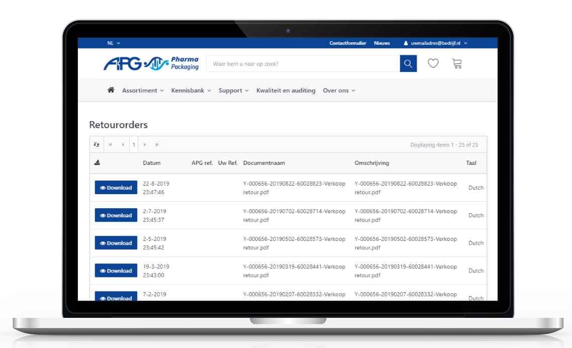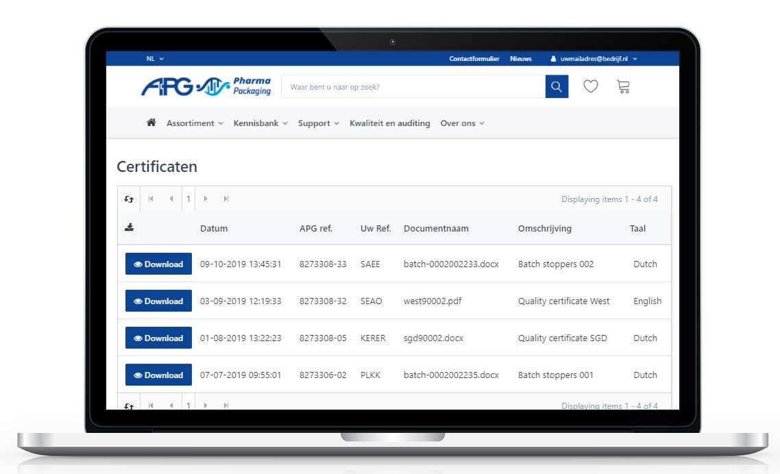 Compliancy is key. APG Europe issues various types of certificates, including quality certificates, analysis certificates, conformity certificates and ISO certificates. Your certificates can be found under 'Certificates' within the Quality & Docs module. Each certificate has the following additional information: